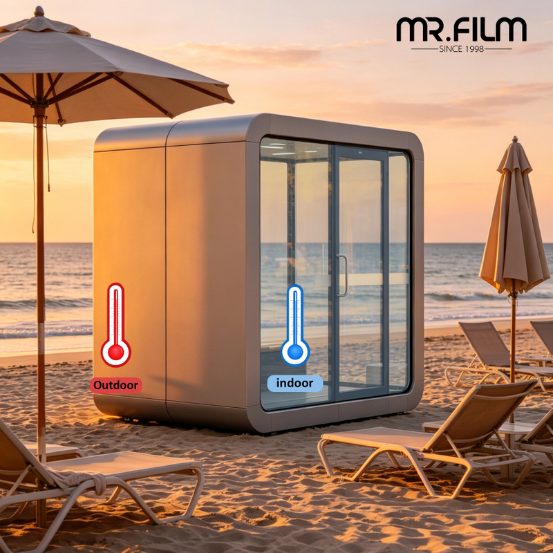 Mr. Film изготовлен из прочных, устойчивых к царапинам материалов, способных противостоять воздействию внешних факторов, сохраняя при этом кристальную прозрачность. Независимо от того, размещена ли эта пленка на солнечной площади, в рабочем пространстве на крыше или в кампусе под открытым небом, ваша акустическая кабина останется комфортным и пригодным для использования пространством круглый год.