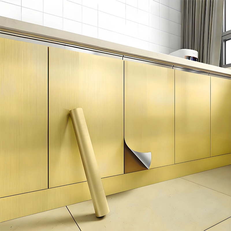 Представляем нашу декоративную пленку премиум-класса с золотистой металлической щеткой — идеальное решение, мгновенно придающее элегантность и роскошь любому пространству. Эта потрясающая пленка воспроизводит теплый блестящий блеск и характерную линейную текстуру настоящего матового золотого металла. Он превращает обычные поверхности, такие как шкафы, мебель, колонны, бытовая техника и акцентные стены, в необычные дизайнерские решения. Испытайте утонченную атмосферу настоящего металла без непомерных затрат или сложной установки, легко создавая визуально захватывающую и высококачественную эстетику.